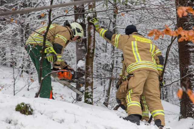 Nur Bäume am Straßenrand verhindern, dass das Auto umkippt und einen Abhang hinabstürzt - Feuerwehr rückt aus, um Bäume von der Schneelast zu befreien - Kameraden kommen auf dem Rückweg aufgrund der Glätte ins Schlingern und rutschen mit Einsatzfahrzeug von der Straße.
